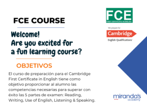 Objetivo del curso: proporcionar al alumno el material necesario para superar las competencias con éxito las 5 partes de examen: Reading, Writing, Use of English, Listening & Speaking.